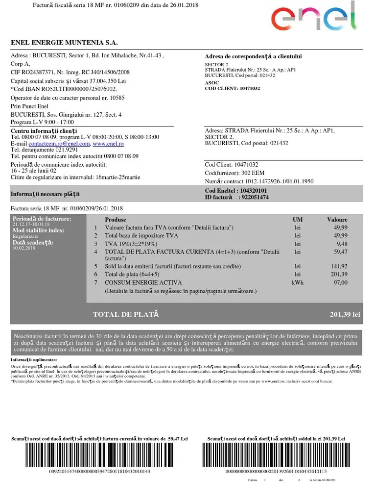 Cod Eneltel Pe Factura Enel / Myenel Contul Meu De Pe Enel Ro Facturi Enel Online Platite Online In Siguranta. Scanați acest cod dacă doriți să achitaţi factura curentă în valoare de. Nu gasesti codul eneltel sau codul client de pe factura enel? Noul serviciu de plată în numerar a facturii enel energie şi enel energie muntenia este disponibil acum în . Cod client cod furnizor id factura nr contract cod enel tel Codul eneltel si codul client. Cît am de plata factura enel. Id factura total de plata. Am grupat informațiile în funcție de importanța lor pentru tine și am adăugat un grafic prin care poți înțelege mai ușor componentele facturii pentru a ști .